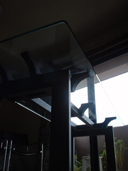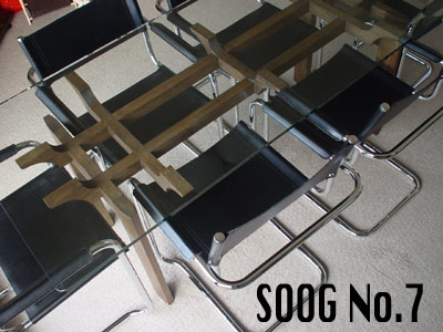.7も結構いい出来。全て木組みのみビスもいっさい使用していない。どんなスタイルにも合うデザイン どこから見てもいい!笑。特に下から見上げた姿は,本当に寺仏閣の天井!目が「ぐっ!」と吸い寄せられると自画自賛!椅子は,私物、近いうちに紹介させて頂きます。分かる人には分かると思いますが。。。少し考えが有りまして。笑。仕上げの色や椅子でがらっと雰囲気が変わります。No.7 low(クリア)と比べて頂ければわかって頂けると思いますが。クリア仕上げで仕上げたlowは、畳にも合います。一方こちらの黒のhighは、和、洋、アジアンと仕上げの色、材で全てのスタイルに合う事がわかって頂けると思います。白染にしてプロバンス風もいい。材料が木なので木の椅子にもあう。がこれだけ個性のあるテーブルに合致出来る木の椅子のデザイン。これが問題だなー。そうとう難しいが一応デザインは、出来ている。けど合うかどうか。。。。紹介出来る日を楽しみにして下さい。